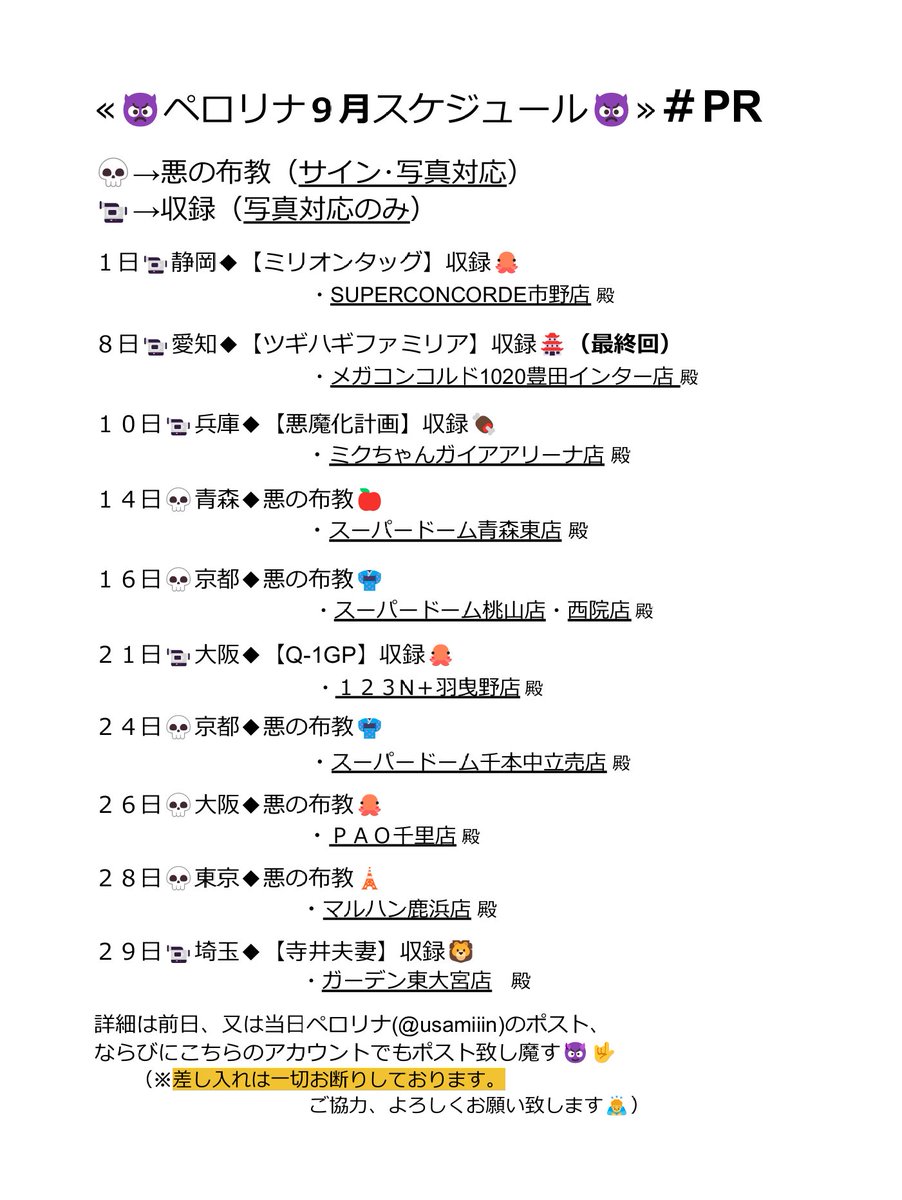 ペロリナ9月スケジュールです👿 ここ数ヵ月、ゆっくりする時間すらほぼなく事務仕事と外仕事にヒーヒー追われたけど、逆に多忙すぎたからか意外と元気に8月も乗り越えた…🔥💀 まだまだメンバーのあれこれ考えることも山積みなんだけど、9月はもう少し自己回復もしつつがんばりやす☠️