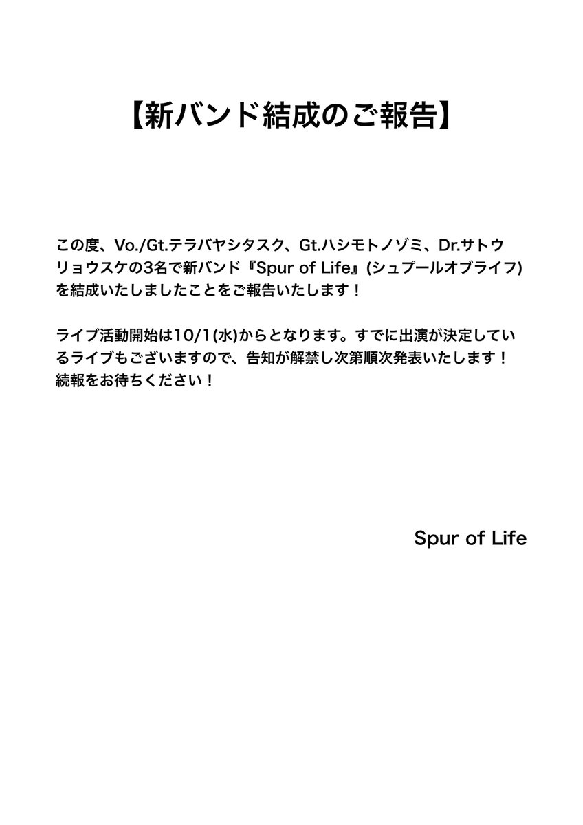 Spur of Life(@s_o_l_band)Vo./Gt. 大きな声で歌いながら大きな音で演奏する活動をしています。 Joined February 2014-