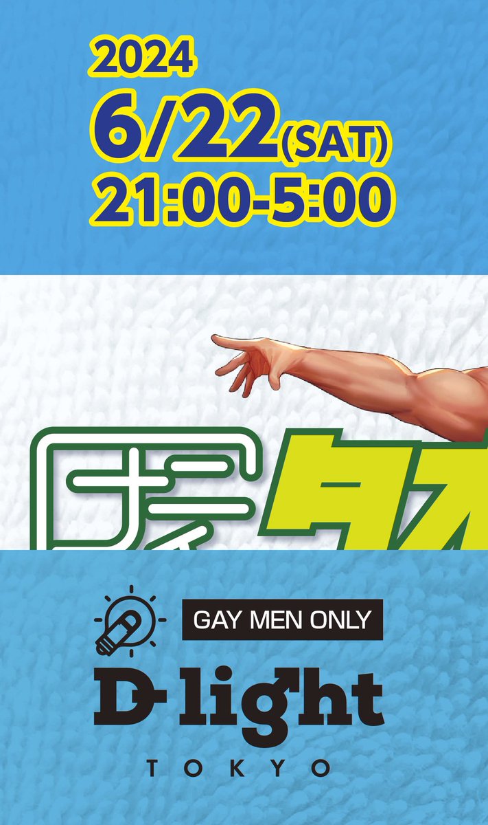 Saturday, June 22, 2024, 21:00~ Naniichi Towel Summer Rebellion @D_light_Tokyo The dress code is to wear one thing and bring a towel. Underwear and a towel around your neck It is more economical to bring your own towel, but disposable clean bath towels are also available.