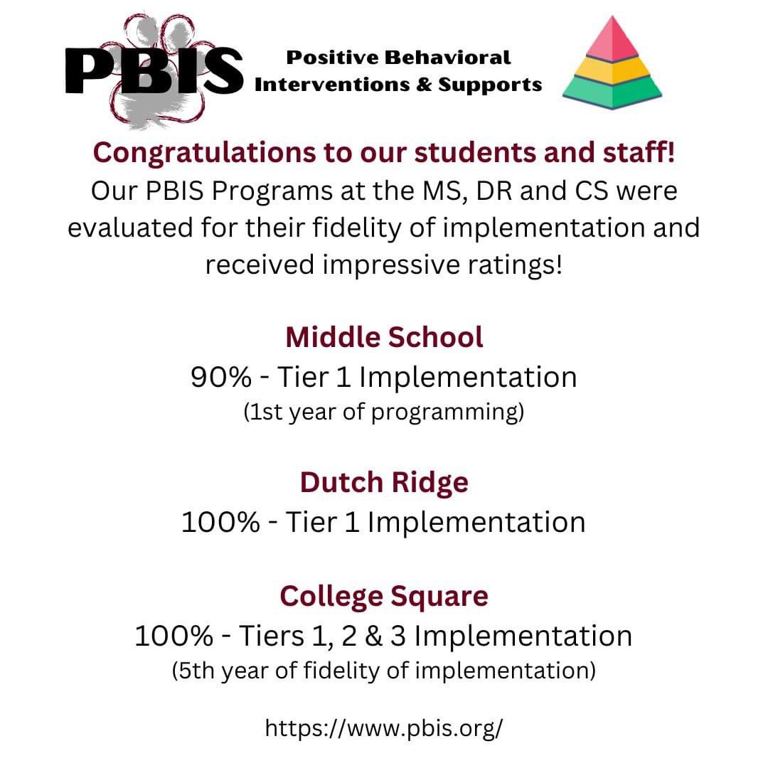 Congratulations to the staff and students at the Middle School, Dutch Ridge and College Square for their outstanding ratings for their PBIS state fidelity checks! Our PBIS teams are led by our school counselors and building principals. #BobcatProud