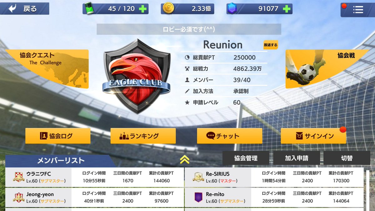 Reunion、協会メンバー募集中です😗 戦力100万以上でLobiできる方、 リプ・DM・ゲーム内チャットでお声掛け下さい🙏 #モバサカC