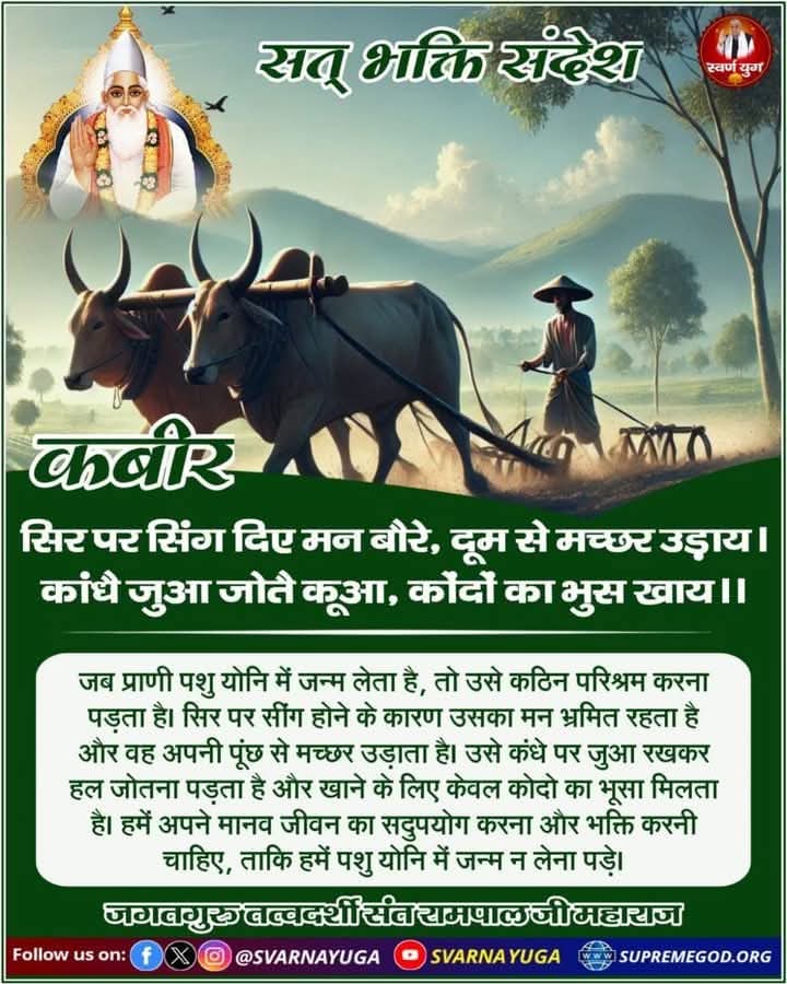कबीर परमेश्वर जी ने बताया है.... जब प्राणी पशु योनि में जन्म लेता है, तो उसे कठिन परिश्रम करना पड़ता है। सिर पर सींग होने के कारण उसका मन भ्रमित रहता है और वह अपनी पूंछ से मच्छर उड़ाता है। उसे कंधे पर जुआ रखकर हल जोतना पड़ता है और खाने के लिए केवल कोदो का भूसा मिलता है।