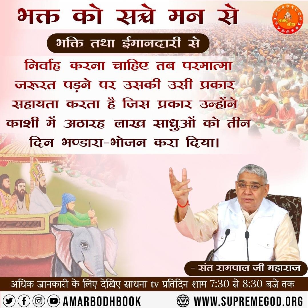#सत_भक्ति_संदेश भक्त को सच्चे मन से भक्ति तथा ईमानदारी से निर्वाह करना चाहिए तब परमात्मा जरूरत पड़ने पर उसकी उसी प्रकार सहायता करता है जिस प्रकार उन्होंने काशी में अठारह लाख साधुओं को तीन दिन भण्डारा - भोजन करा दिया। देखिए संत रामपाल जी महाराज यूटयूब चैनल पर #GodMorningThursday
