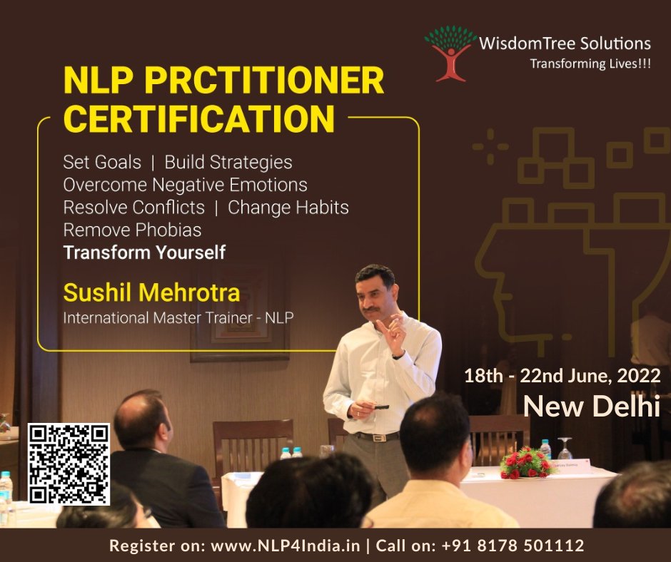 Our upcoming #NLPPractitioner Certification programs are scheduled in Delhi and Pune: Delhi - 25th till 29th January 2023 For details, call +91 81785 01112 or mail us at [email protected] Team WisdomTree nlp4india.in nlp.pw #NLPCertification