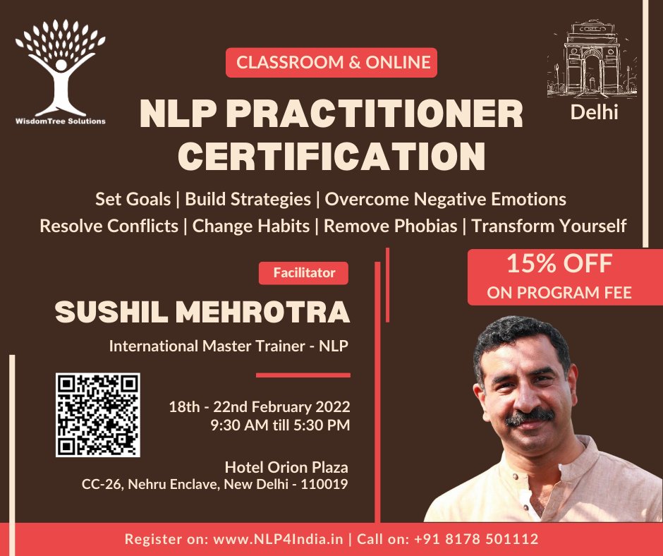 Up next #NLPPractitioner Certification from 18th February till 22nd February in Delhi. Give us a call at +91 8178 501112 for more details or visit NLP4India.in | NLP.pw