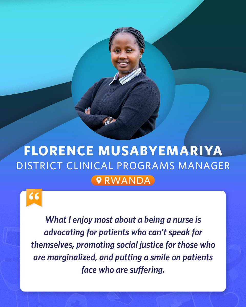 Meet Florence Musabyemariya, district clinical programs manager in Rwanda. “What I enjoy most about a being a nurse is advocating for patients who can't speak for themselves, promoting social justice for those who are marginalized, and putting a smile on patients face…” 5/