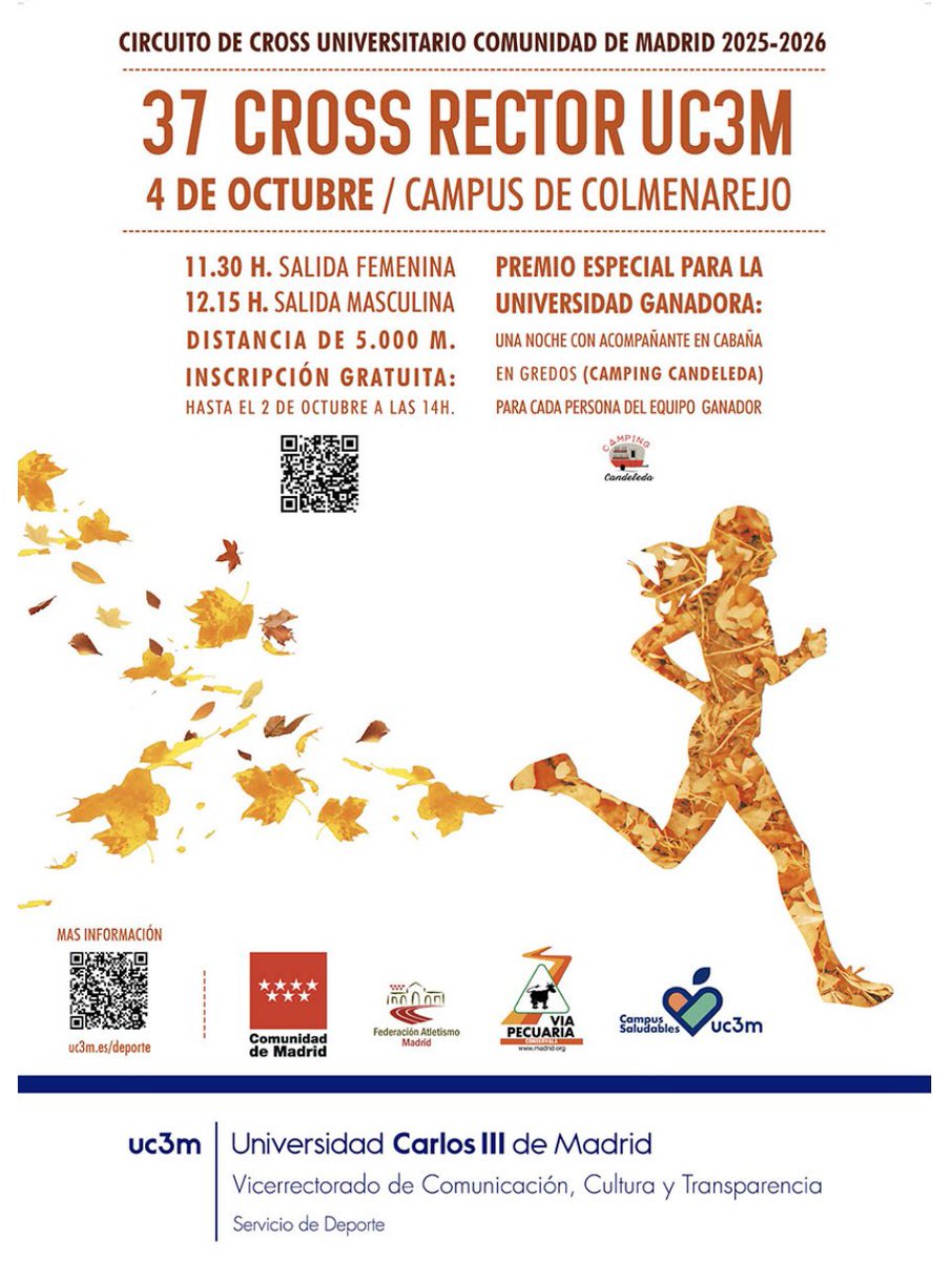 ¡Ya está aquí el 37 Cross Rector UC3M! 🏃♀️🏃♂️🍂 📍 Campus de Colmenarejo 🗓 4 de octubre ⏰ 11:30 h salida femenina / 12:15 h salida masculina 📏 5.000 m ✅ Inscripción gratuita hasta el 2 de octubre ℹ️ Toda la info del evento 👉 crossuniversitario.com/carreras/19-20… ¿Preparad@s? 🔥💪 #Cross