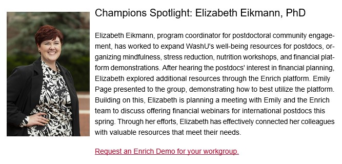 OPA is committed to wellness! Program Coordinator, Elizabeth Eikmann, was featured in this month's WashU Wellness Champion newsletter for her efforts to provide programs and resources that help #WashUPostdocs better meet their wellness needs.