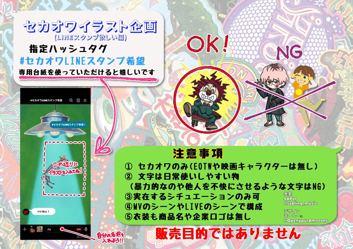 【報告】セカオワイラスト企画 フェーズ4を開催します‼️ 条件に 『INSTANTRADIO』が追加されます LINEスタンプっぽいイラストを沢山描いてくれたら嬉しいです✨ ハッシュタグは引き続き #セカオワLINEスタンプ希望 を付けて参加してください 注意事項と専用台紙です