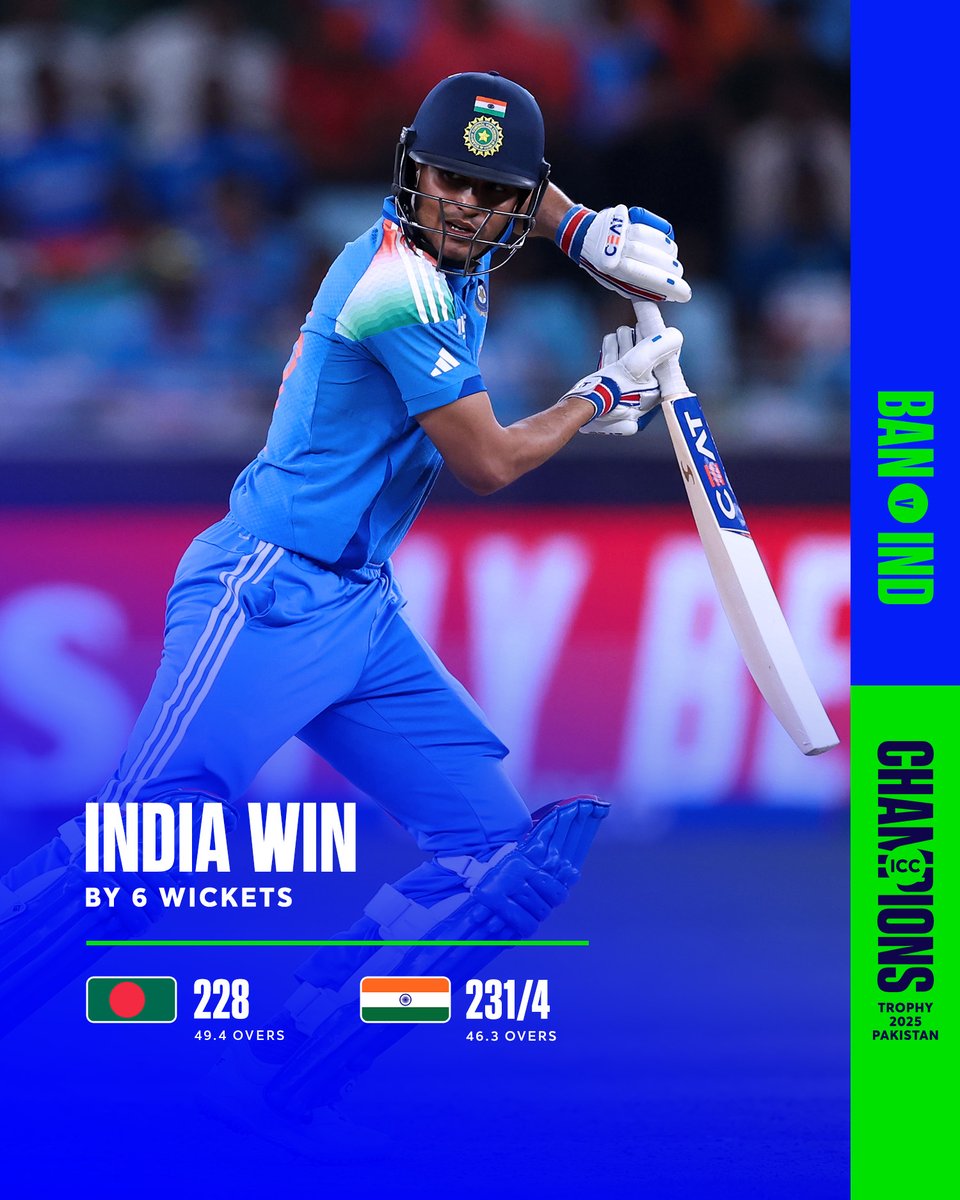 A fighting century from Shubman Gill helps India begin their #ChampionsTrophy campaign with a win 👏 #BANvIND 📝: icc-cricket.com/tournaments/ch…