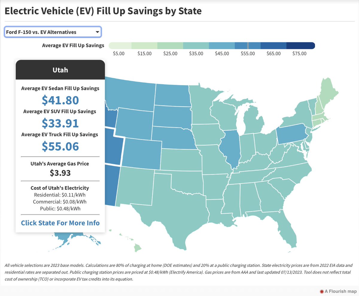 Curious what EV drivers save on fill up costs compared to gas car/truck drivers? Look no further! @EnergyInnovLLC's new tool & map shows avg. costs and savings for every state, for sedans, SUVs, and trucks. Every state sees savings, especially for trucks! bit.ly/3sb4YAA