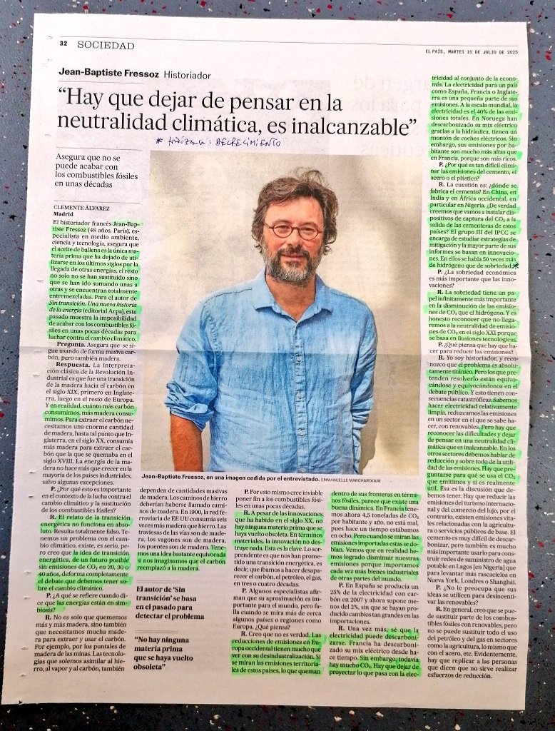Una entrevista importante sobre un libro importante: 'Sin transición', @arpaeditores Donde Fressoz dice "sobriedad", entiéndase: decrecimiento (en el uso de energía y materiales).