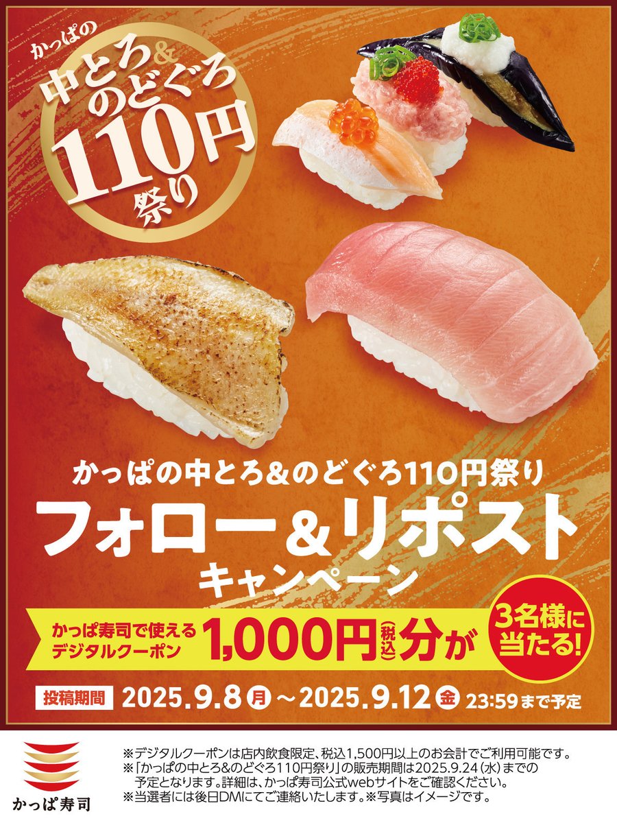 #かっぱの中とろのどぐろ110円祭り開催中 フォロー&リポストキャンペーン 1️⃣@kappasushi_jp をフォロー 2️⃣この投稿をいいね&リポスト❤️ 抽選で3名様にかっぱ寿司で使えるデジタルクーポン1000円分🎁 応募は9/12 23:59迄✨ #かっぱ寿司 でお得に味わえる、幸せなひとときを✨