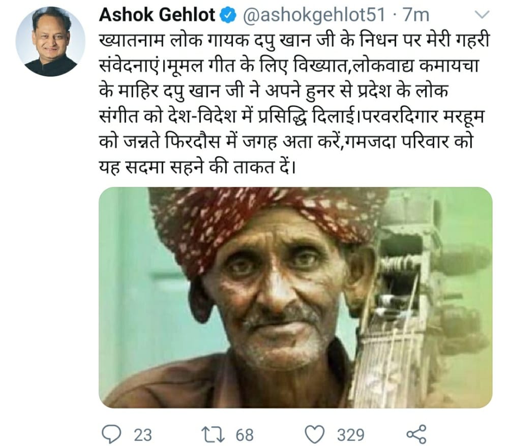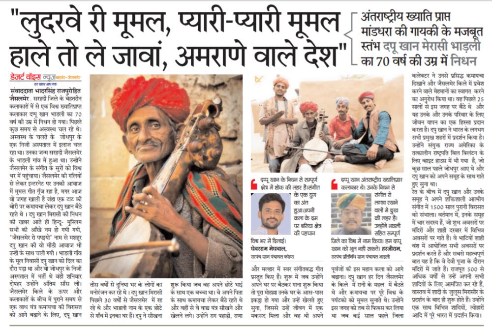 भाडली के कोहिनूर लोक कला की महान शख्सियत दपु जी भाडली इस दुनिया से रुखसत हो जाना जैसलमेर ही नही पूरे देश के लिए बहुत बड़ी क्षति है प्रभु उन्हें अपने चरणों मे स्थान दे