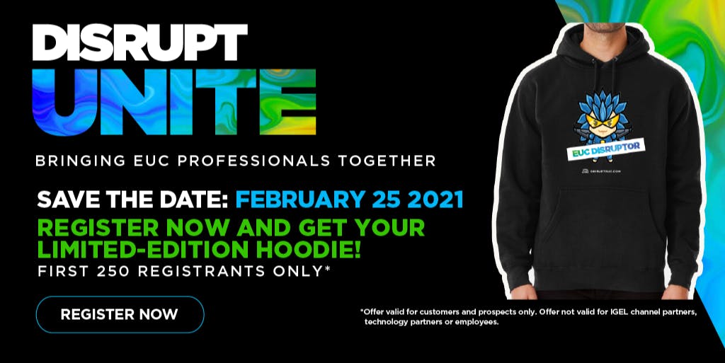 Mark your calendars and register now! DISRUPT UNITE is coming February 25, 2021! #disrupteuc #IGEL bit.ly/3aMSd4F