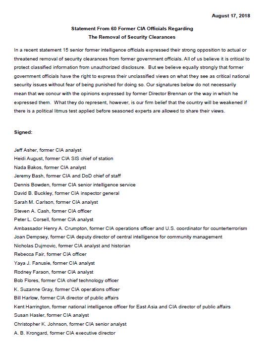 Sixty former CIA officials sign letter responding to the removal of former CIA Director Brennan's security clearance: "The country will be weakened if there is a political litmus test applied before seasoned experts are allowed to share their views."