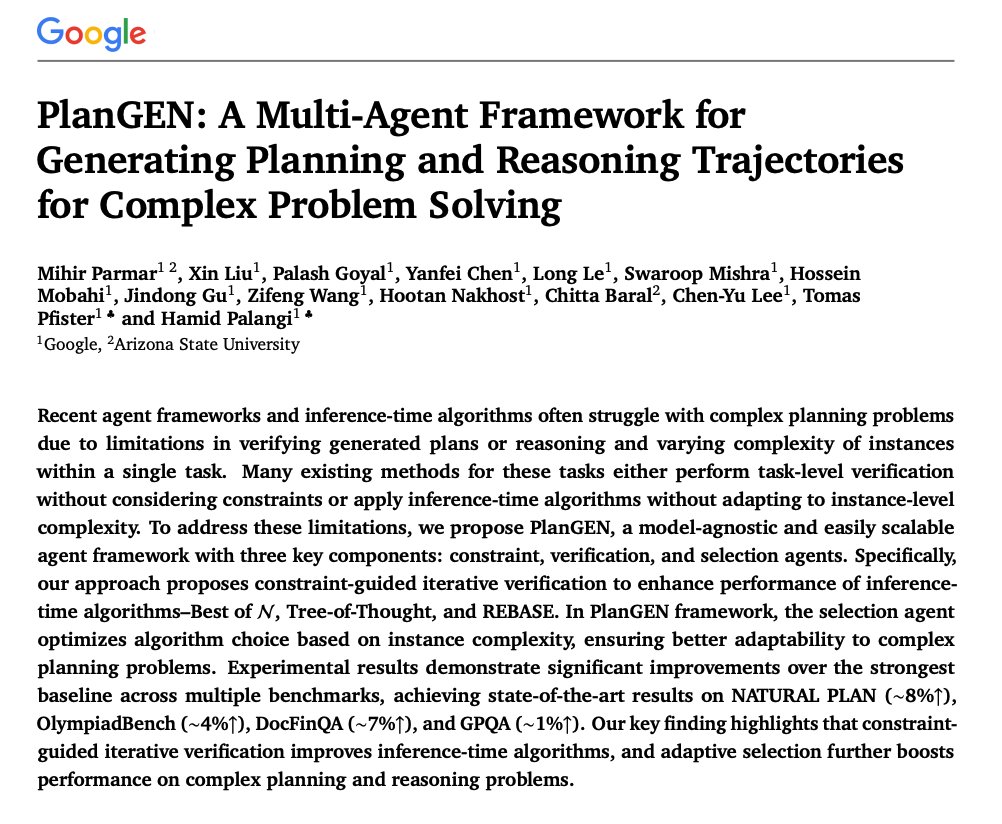 Google presents PlanGEN for complex planning and reasoning. PlanGEN is a multi-agent framework designed to enhance planning and reasoning in LLMs through constraint-guided iterative verification and adaptive algorithm selection. Key insights include: Constraint-Guided…
