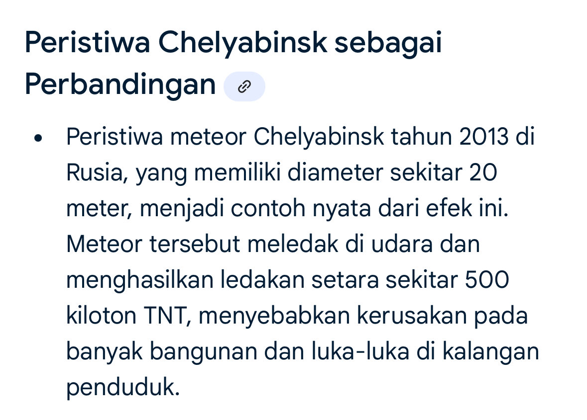 Meteor yg jatuh di laut Cirebon diduga berukuran 20 meter. Dimensinya mirip dgn meteor yg meledak di Rusia dgn kekuatan ledakan 500 kiloton TNT taun 2013 lalu. Sekedar perbandingan bom atom yg meledak di Jepang hanya sekitar 20 kiloton. Harusnya warga kita sujud syukur sih ini. https://t.co/AcnZF8Weir