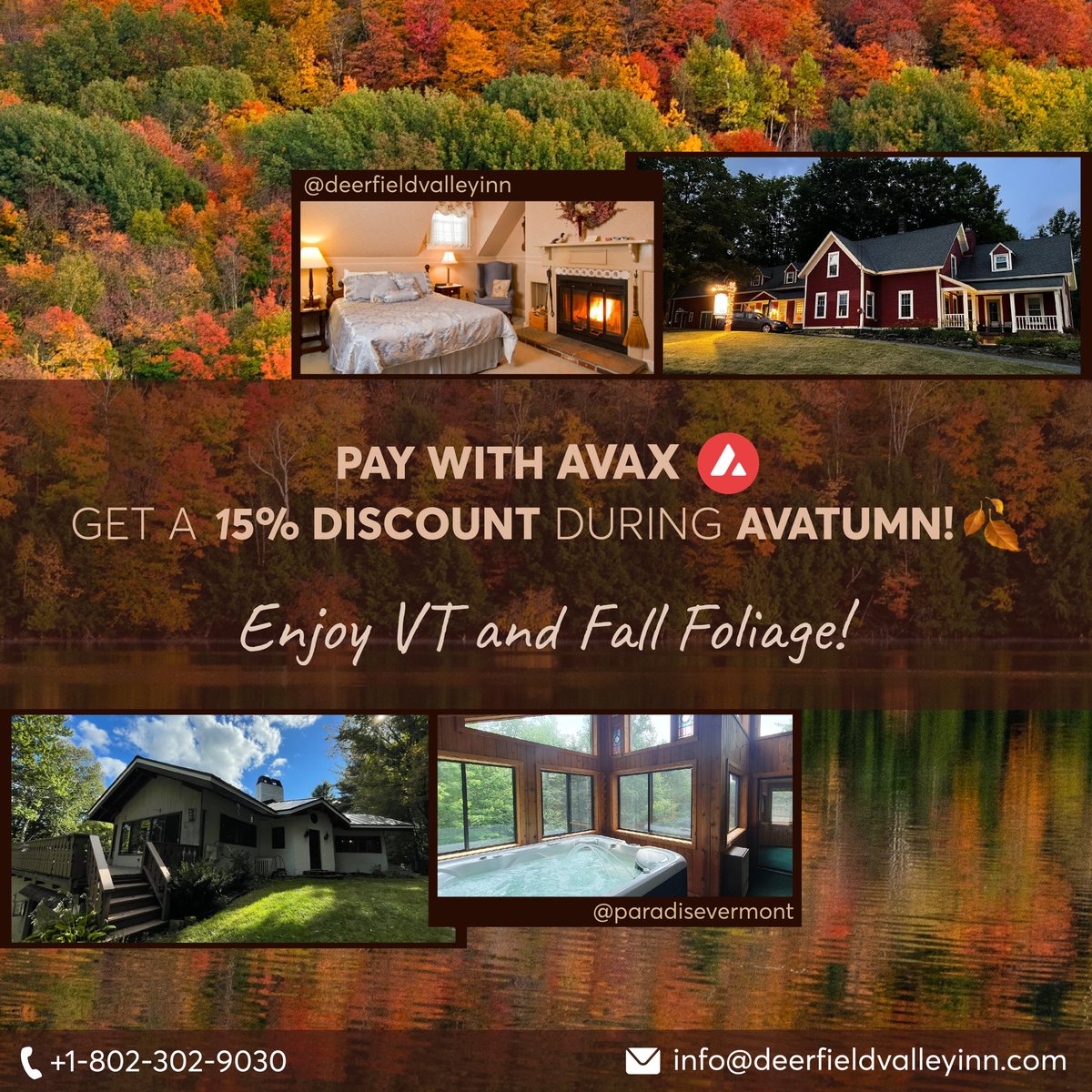 Enjoy #AVATUMN🍂 in VT, pay with #AVAX for a romantic getaway and get a %15 discount ? We got you! Reservations: 📞: +1-802-302-9030 📧: [email protected] Info & Pricing: booking.com/hotel/us/natur… airbnb.com/h/paradiseverm…