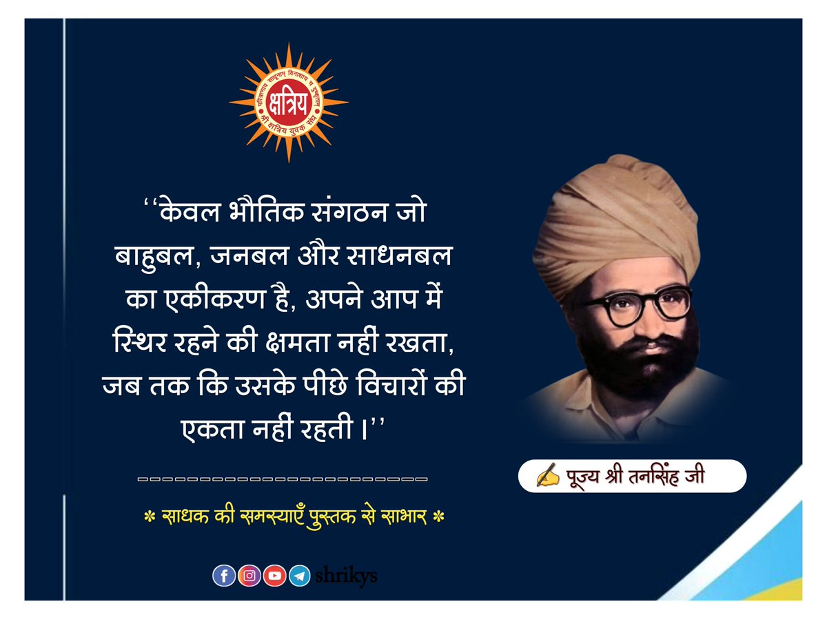 "केवल भौतिक संगठन जो बाहुबल, जनबल और साधनबल का एकीकरण है, अपने आप में स्थिर रहने की क्षमता नहीं रखता, जब तक कि उसके पीछे विचारों की एकता नहीं रहती।" पूज्य श्री तनसिंह जी ('साधक की समस्याएँ' पुस्तक से साभार) #ShriKYS #TanSinghJi #DiamondJubilee
