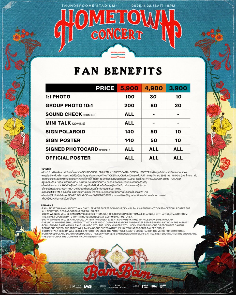 แบมๆเป็นศลปที่เสมอต้นเสมอปลายในเรื่องการมอบความรักให้กับฟค เรื่องอื่นๆมันสัมผัสกันด้วยใจ แต่การพยายามคุมราคาไม่ให้เลยเถิด "เข้าใจ" สิ่งที่ฟคต้องเจอแล้วพยายามลดทอนมากที่สุด อันไหนสุ่มก็สุ่มไปไม่ต้องวัดแค่เงิน ขอให้เป็นคอนเสิร์ตที่ประสบความสำเร็จมากๆครับ #BamBam_Concert_HOMETOWN
