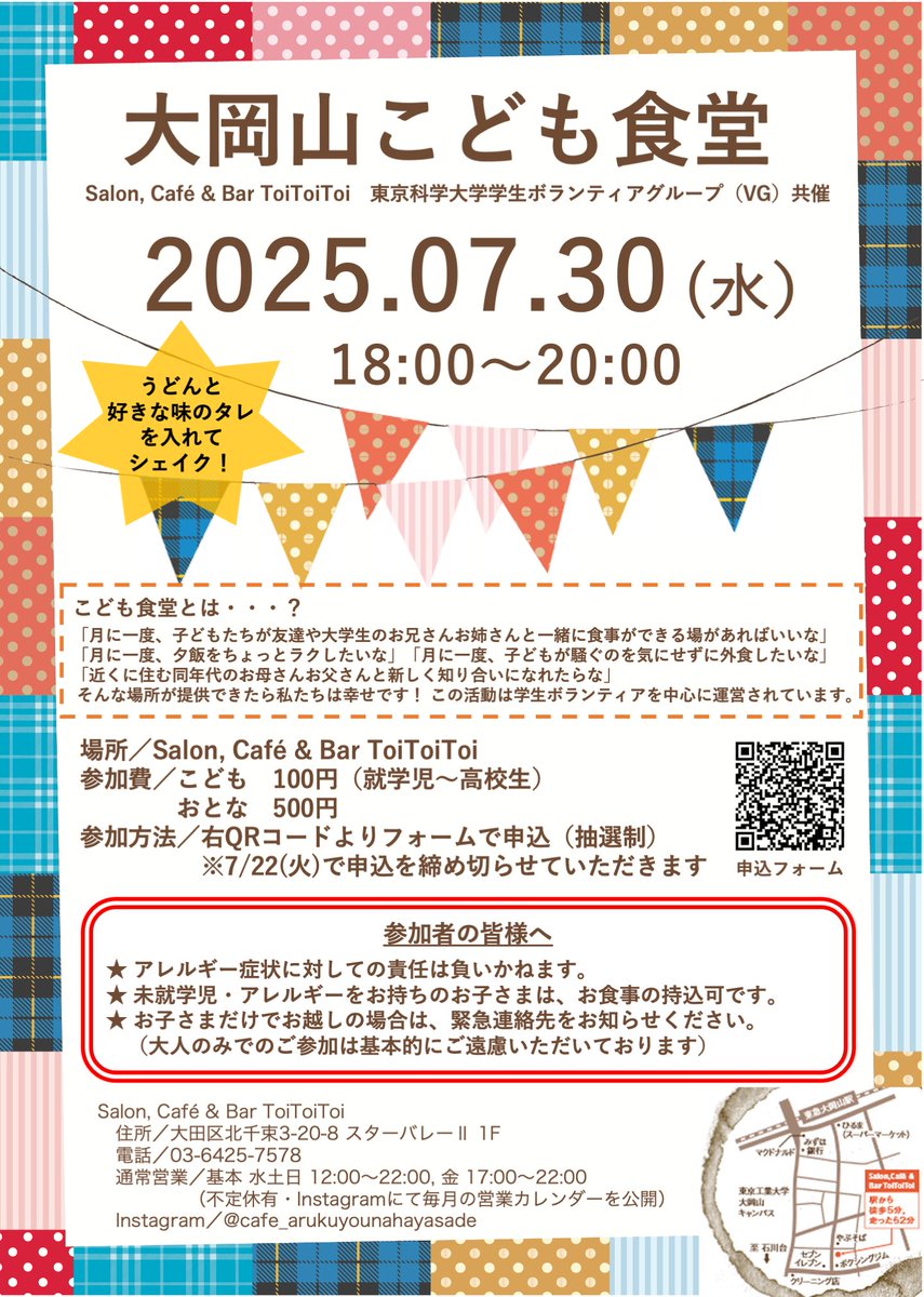 【大岡山 #こども食堂 】 今月のこども食堂は7/30(水)です! 好きな味を選んでシェイクうどんを作りましょう✨ 参加をご希望される方は、7/22(火)までにポスター内のQRコードからお申し込みください! 抽選を行い、7/23(水)を目途に参加可否をお知らせいたします🙇🏻♀️
