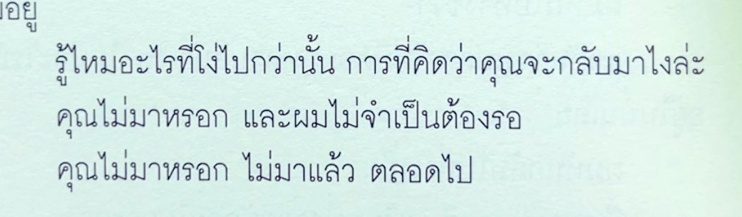 เป็นโทนน้ำเสียงเรียบนิ่ง แต่มองพื้น สีหน้าเจ็บปวด พยายามห้ามน้ำตา “ไม่มาหรอก ไม่มาแล้ว ตลอดไป” แล้วเงยหน้ามามองแบบตาคลอไปด้วยน้ำตา (หนังสือผม)