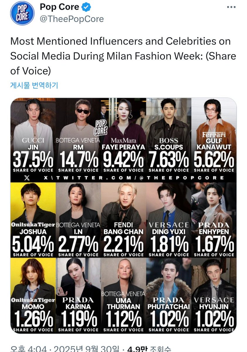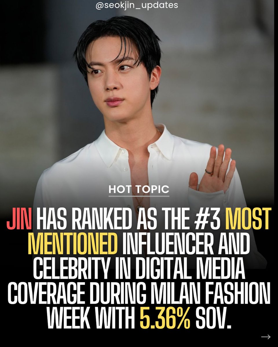 Jin has ranked as the #3 MOST MENTIONED influencer and celebrity in media (digital news) during Milan Fashion Week! #3. Jin - 5.36% SOV (Share of Voice) “Jin’s Gucci dominance shows how social buzz can infiltrate editorials. Here, coverage is more selective, focusing on…