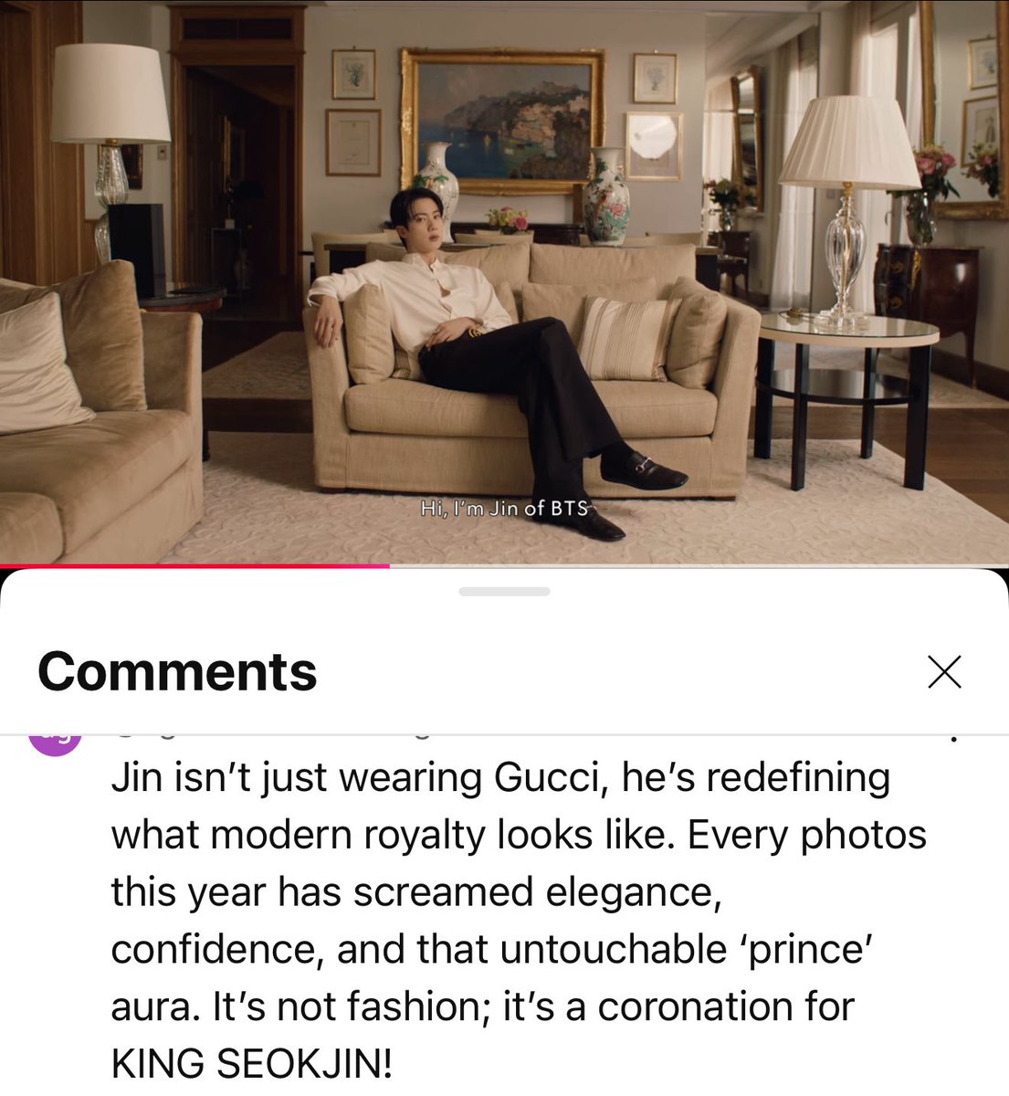 [Gucci YouTube] I totally agree with this comment! “Jin isn't just wearing Gucci, he's redefining what modern royalty looks like. Every photos this year has screamed elegance, confidence, and that untouchable 'prince' aura. It's not fashion; it's a coronation for KING SEOKJIN!”…