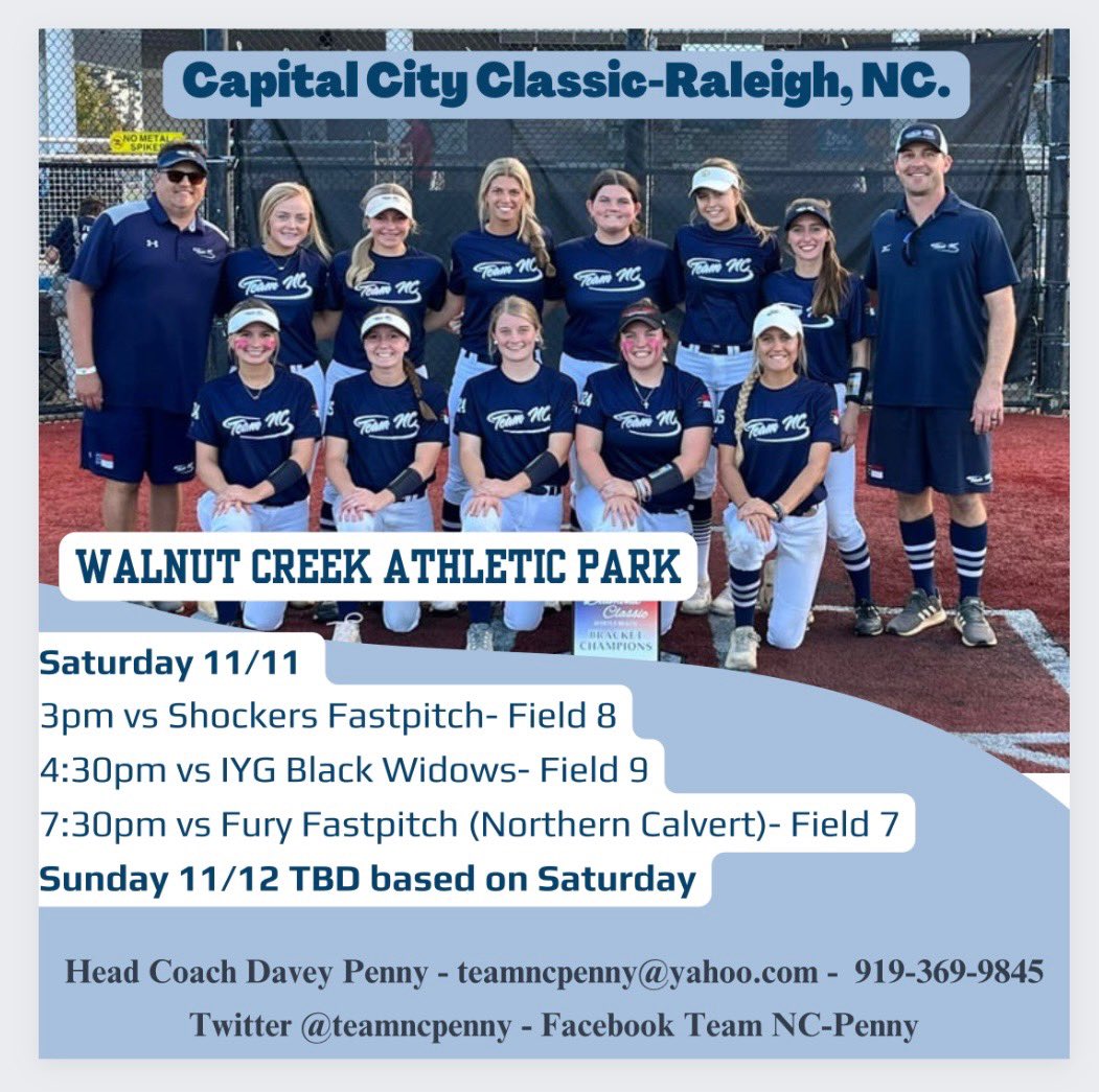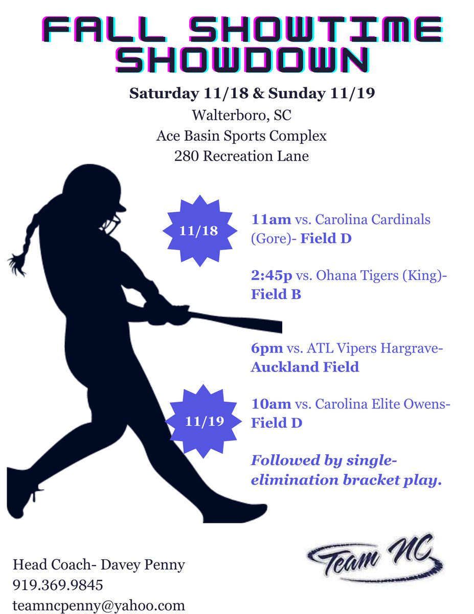 Coaches, see below for our schedule this coming weekend in Walterboro. If you have questions or need info on any of our players, please feel free to dm us here or email the team account on the profile sheet. @TeamNCSoftball
