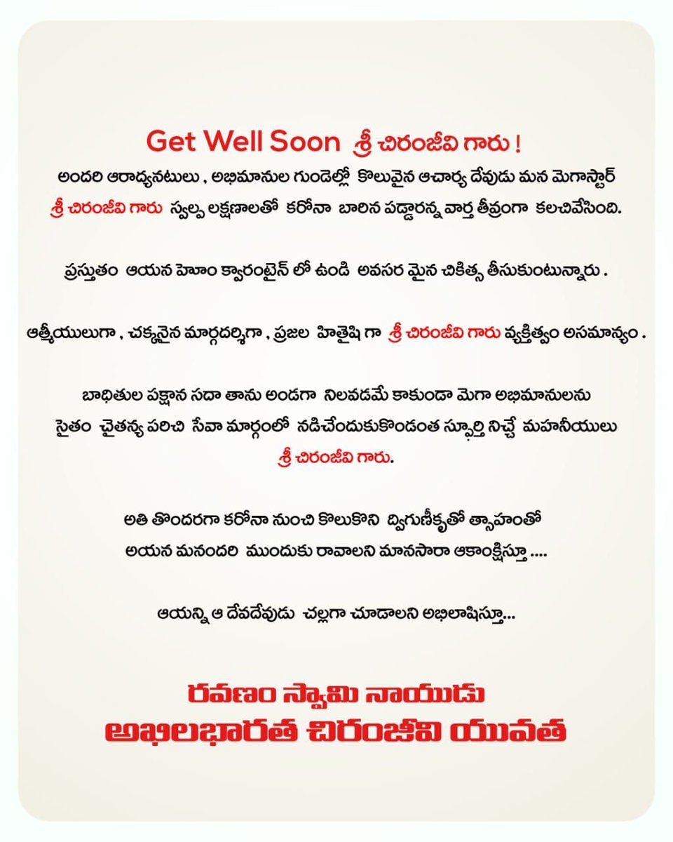 Wish you a speedy recovery #Boss @KChiruTweets ❤️❤️❤️