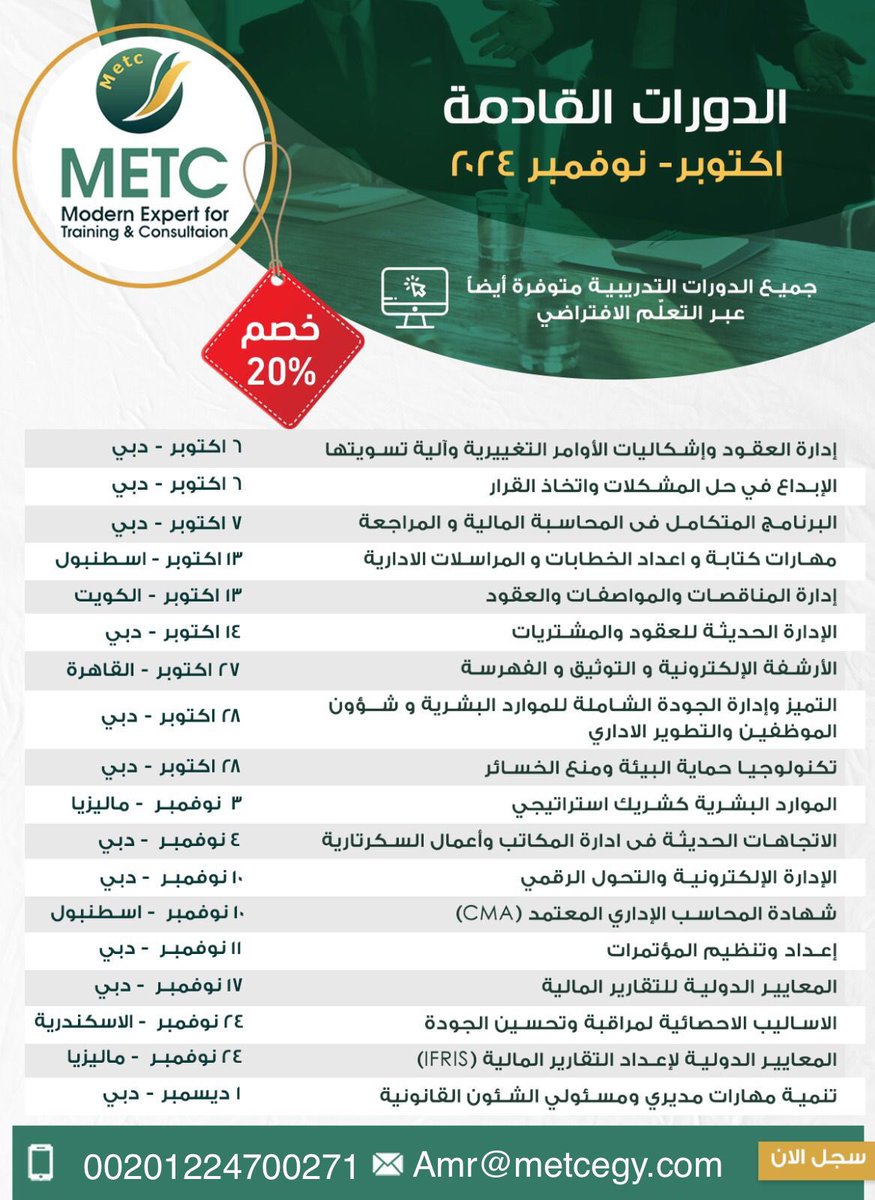 #دورات #اكتوبر #نوفمبر #خصم٢٠٪ #اداره #قانون #سلامه_بيئه #الارشفه #الموارد_البشريه #محاسبه #ماليه للحجز و الاستفسار 00201224700271 [email protected]
