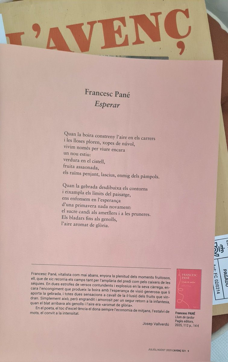 Josep Vallverdú coneix Francesc Pané i en coneix l'obra, en prosa i en vers. En aquest número de juliol de @L_Avenc publica un apunt sobre el poema 'Esperar' de 'Llum de tardor'. Delicadíssim.