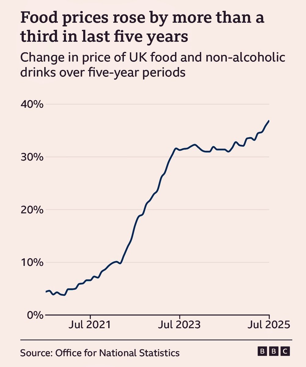 ▪️UK food prices have increased by 37% in the last five years. ▪️For the 2024/25 financial year, Tesco reported an adjusted operating profit of £3.1 billion. On the basic essentials like food, we are being fleeced by enormous corporate greed.