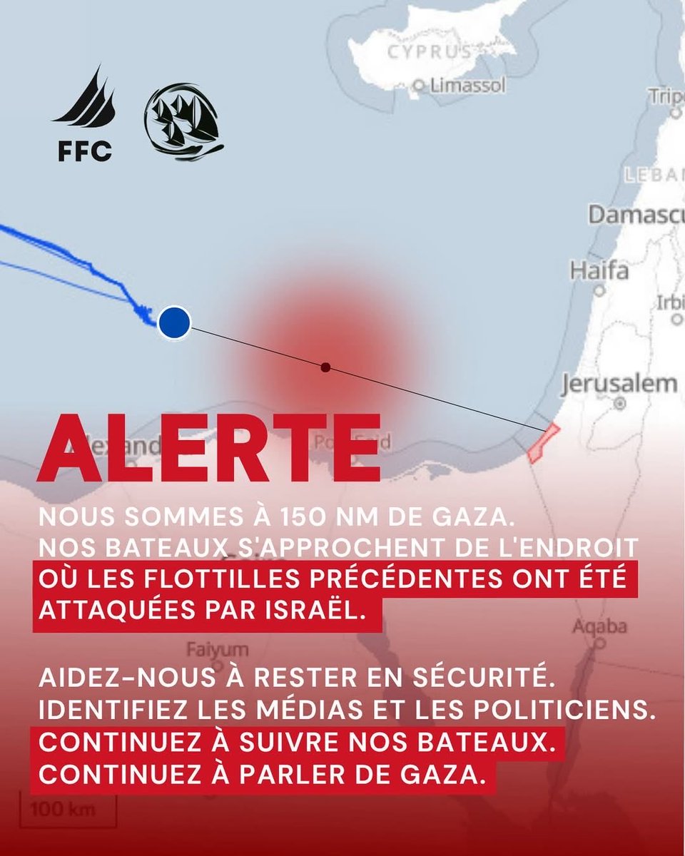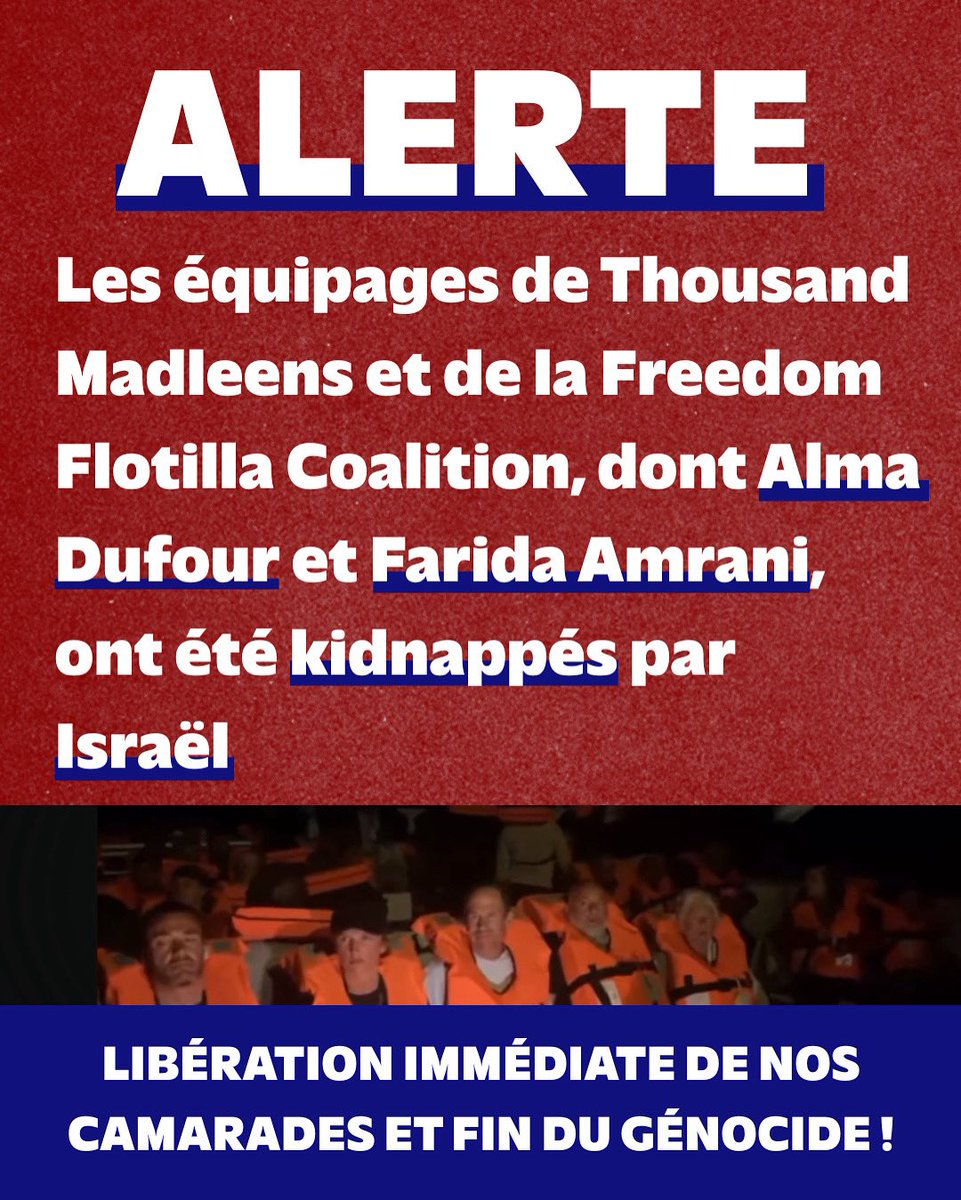 🚨Les équipages de Thousand Madleens et de la Freedom Flotilla Coalition, dont Alma Dufour et Farida Amrani, ont été kidnappés par Israël !