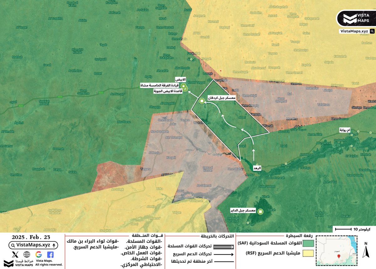 ﷽ 🟩تم بالقوة العسكرية: - فك حصار مدينة الأُبيض عروس الرمال. - فرض سيطرة القوات المسلحة على معسكر جبل كردفان ودخول قوات الفرقتين 16 و18 مشاة إلى مقر رئاسة الفرقة الخامسة مشاة. {قاتِلوهم يُعذّبهم اللَّهُ بِأيديكم ويُخزِهم وينصركم عليهِم ويشفِ صدور قومٍ مؤمنين ۞}.