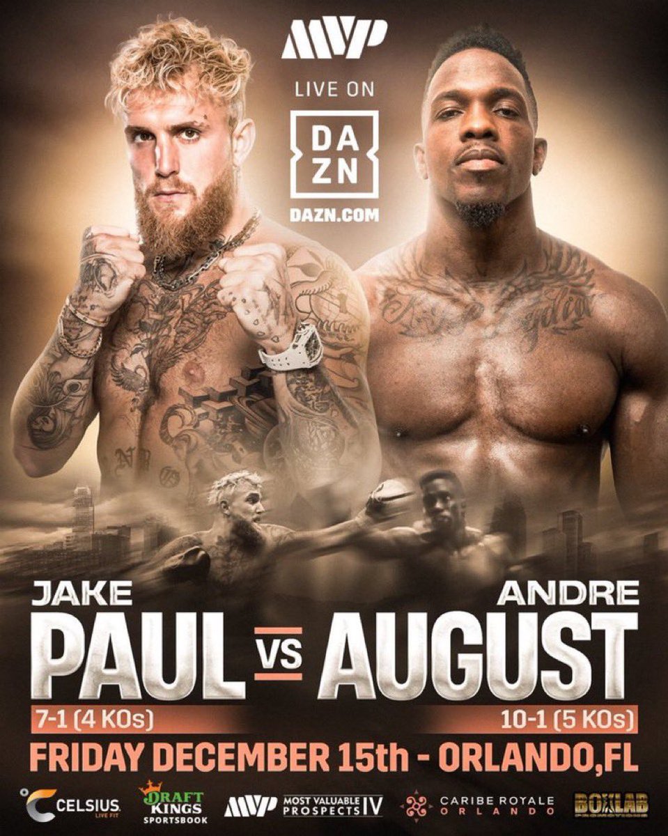 BREAKING: Jake Paul’s next fight will be against Andre August (10-1, 5 KOs) on Friday, December 15 in Orlando, Florida. August, 35, has a combined opponent’s record of 34-65–6 but has won five bouts in a row. #PaulAugust
