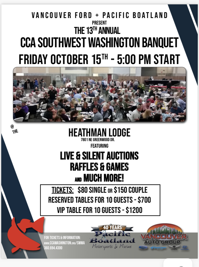 Save the date and register now! Vancouver Ford + Pacific Boatland present the 13th Annual CCA Southwest Washington Banquet on Friday, October 15th-Doors open at 5:00pm.
