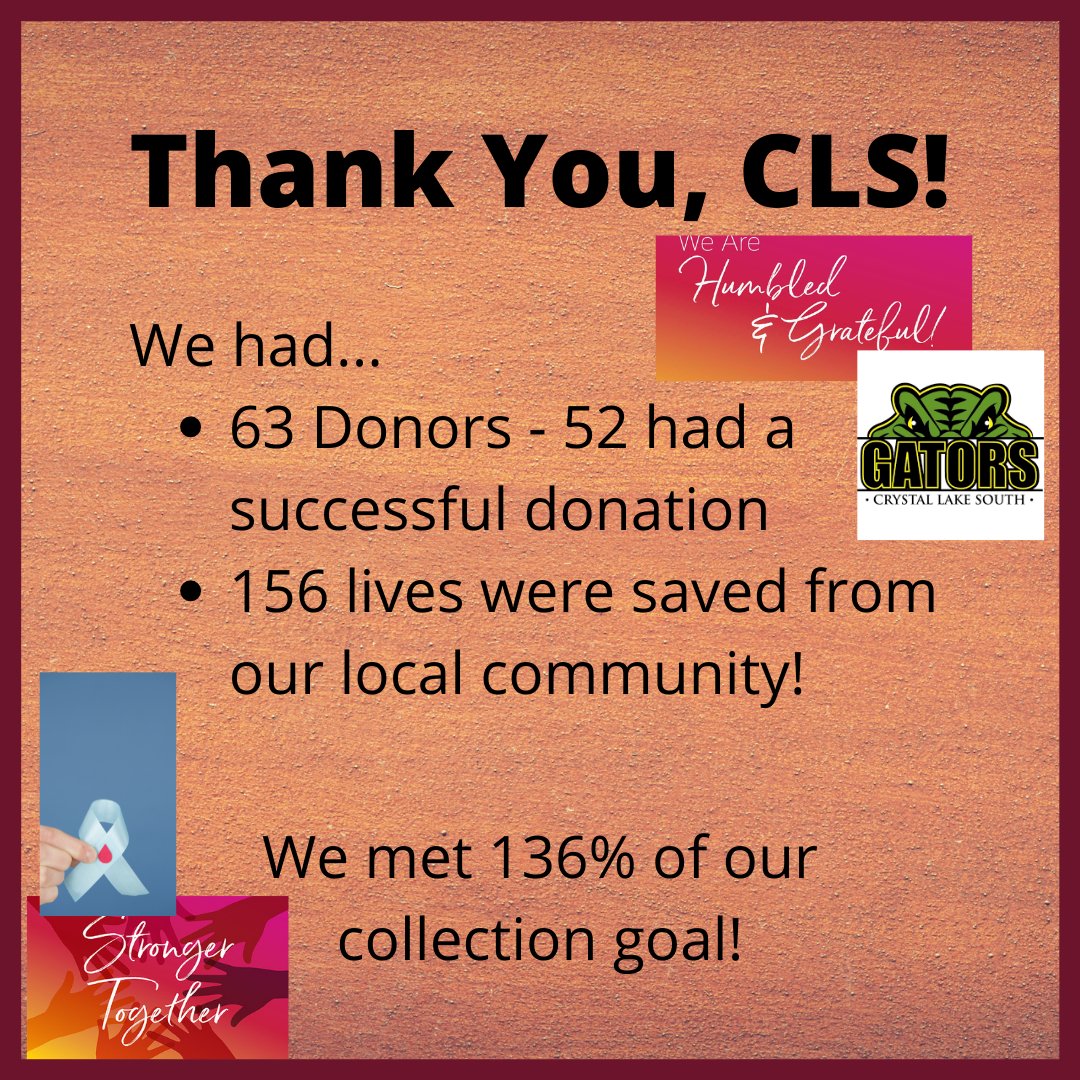 To everyone who helped make our blood drive a success, thank you! We made an enormous amount of progress from our last one, saving 156 lives and collecting 57 blood products, meeting our goal of 42 by 136%! You have made a difference in our community, and we are so grateful!