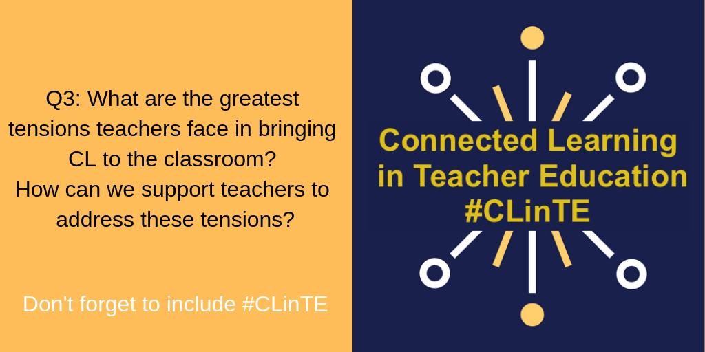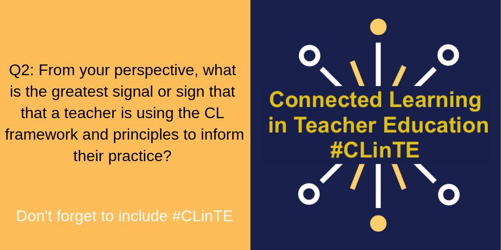 Thank you for joining us for #CLinTE chat. Our host is @infchem and we'll be talking about #ConnectedLearning after #TeacherEd. We'll use the A1/Q1 format. Please remember to tag your Tweets with #CLinTE