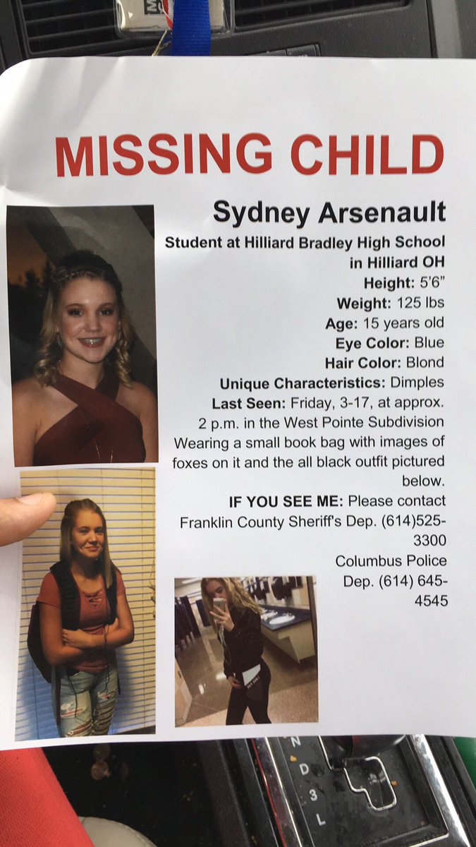 Sydney has been missing since 3.17 @ 2pm. She my be heading to NY. Any information call CPD (Columbus, OH) or Franklin County Sheriff.