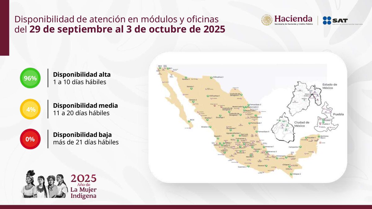 El SAT da a conocer el listado de disponibilidad de citas para atención presencial en los módulos y oficinas desconcentradas en las 32 entidades del país. Semana del 29 de septiembre al 3 de octubre: Disponibilidad alta 96% Disponibilidad media 4% Disponibilidad baja 0%