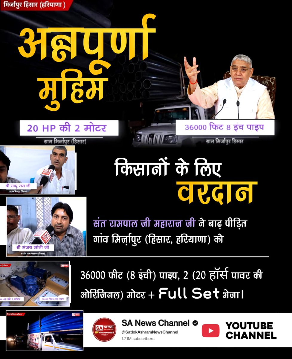 #AnnapurnaMuhim_बनी_वरदान Sa News YtChannel नरेश कुमार, सरपंच प्रतिनिधि किसानों के लिए वरदान संत रामपाल जी महाराज जी ने बाढ़ पीड़ित गांव सिंघवा राघो (हिसार) को 14000 फीट (8 इंची) पाइप, 3 (20 हॉर्स पावर की) मोटर + FULL SET भेजा।