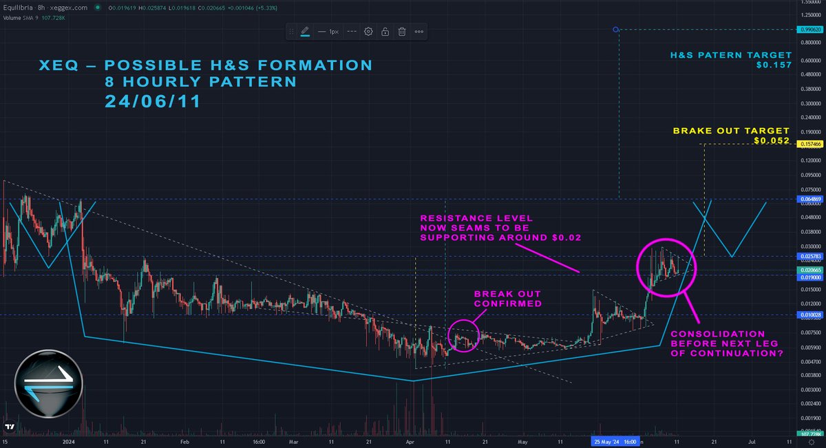 $XEQ chart looks promising! Consolidation above $0.02. If it holds, could target of $0.157 mid term ( next few months). Interim target $0.052 from smaller HS when $0.025 cleared. @EquilibriaDevs $link $dero #btc #eth #xrp $NEXA $QUBIC $XNA $ALPH $TAO $ZEPH $Kas $inj $azero $bonk