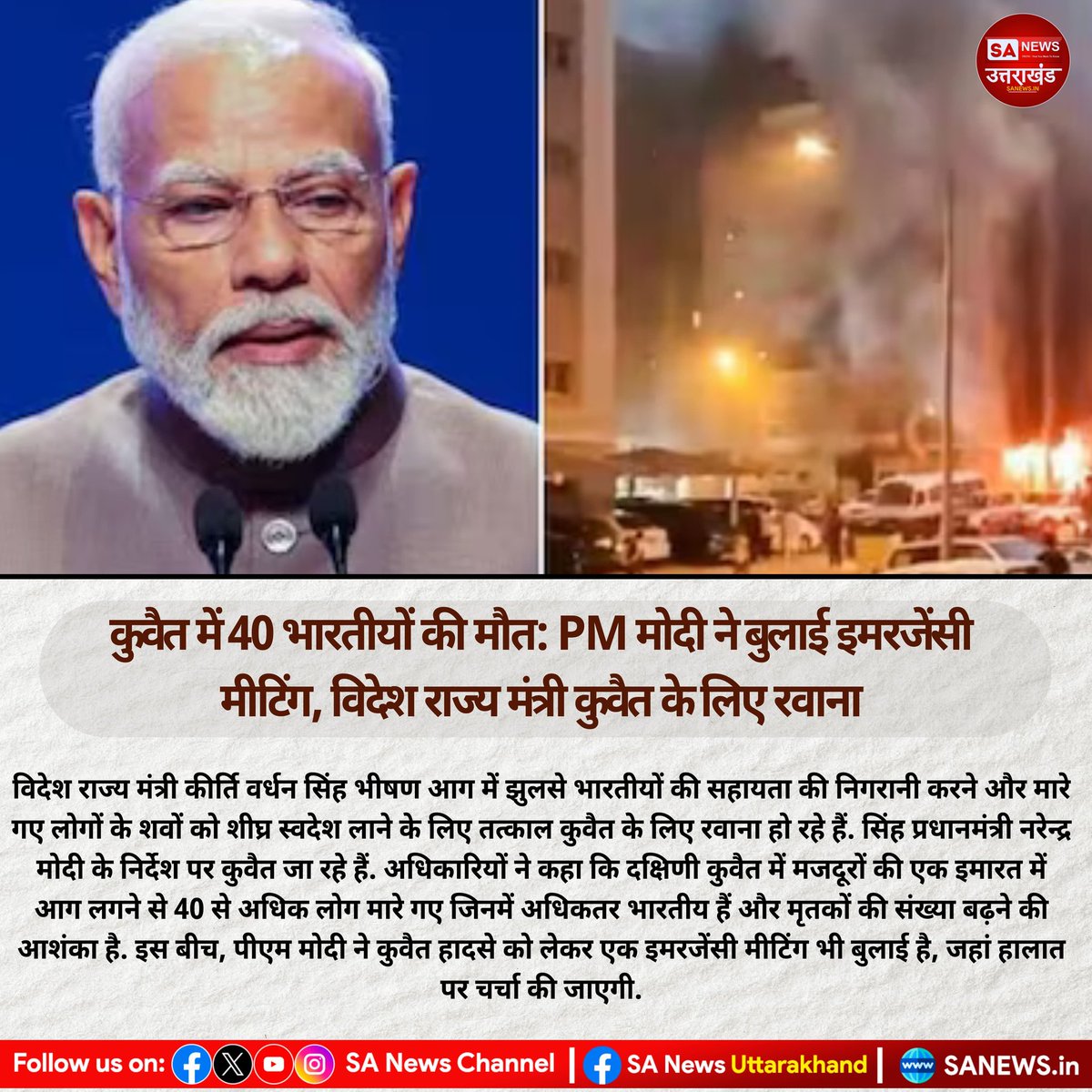 विदेश राज्य मंत्री कीर्ति वर्धन सिंह भीषण आग में झुलसे भारतीयों की सहायता की निगरानी करने और मारे गए लोगों के शवों को शीघ्र स्वदेश लाने के लिए तत्काल कुवैत के लिए रवाना हो रहे हैं. सिंह प्रधानमंत्री नरेन्द्र मोदी के निर्देश पर कुवैत जा रहे हैं।