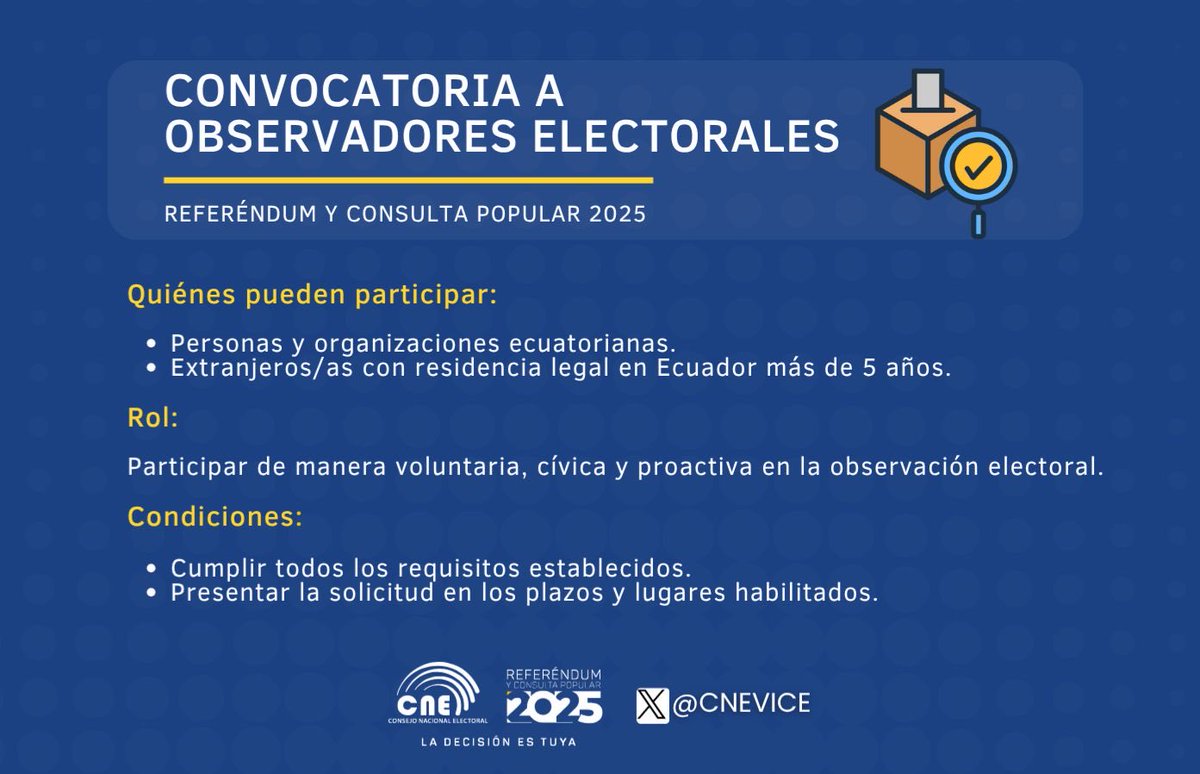 🇪🇨 ¡A través de la observación electoral 🔎 se ratifica el respeto a la voluntad popular expresada en las urnas! 🗓️Hoy, inicia el periodo de acreditación de observadores electorales nacionales para el #ReferéndumYConsulta2025.🗳️ Link de acreditaciones en el primer comentario⤵️