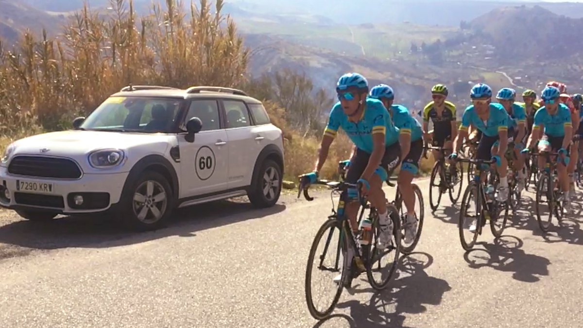 El #MiniCountryman de @gruposafamotor encabezando al pelotón de @VCANDALUCIA con los @AstanaTeam al frente. Una pasada de vehículo el que nos lleva por las carreteras andaluzas. @MINIEspana @fulgsang