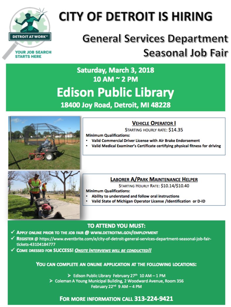 The General Services Department is hosting a seasonal job fair tomorrow, March 3, from 10 a.m. - 2 p.m. at Edison Public Library. For more information, call (313) 224-9421.
