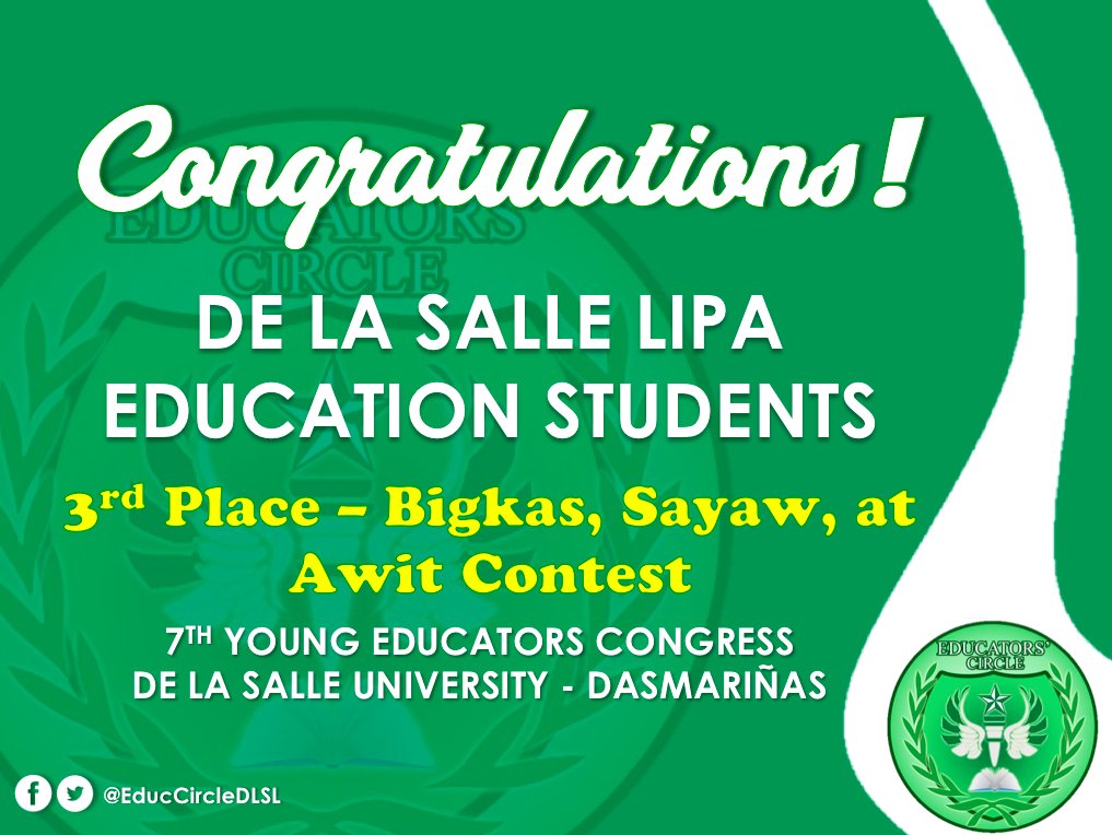 Congratulations! 🎉🎊 De La Salle Lipa Education Students 3rd Place - Bigkas, Sayaw at Awit Contest 7th Young Educators Congress De La Salle University - Dasmariñas Animo La Salle!
