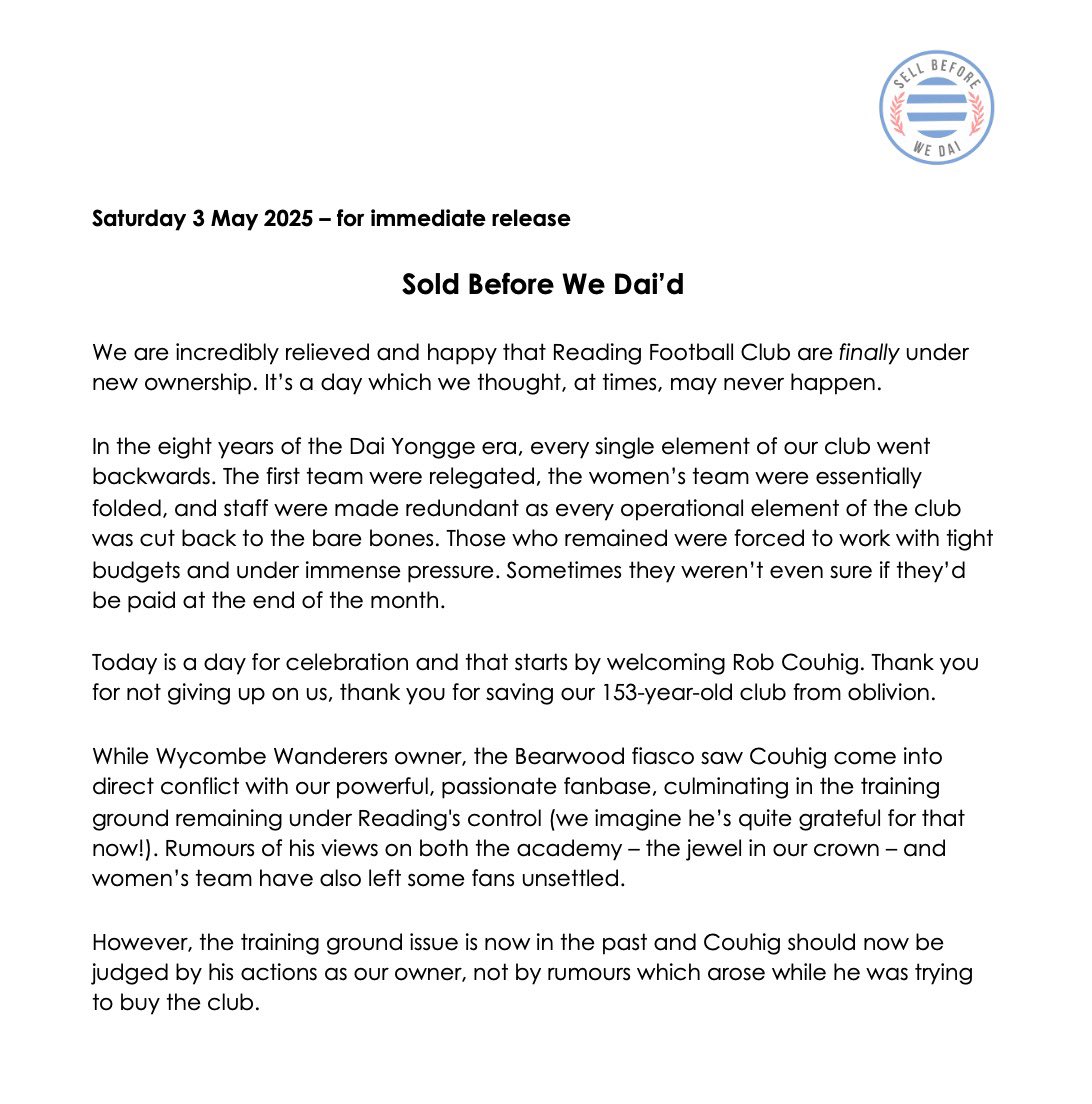 We never wanted to exist and now we’re happy to go out of existence – but we don’t want Reading fans to forget what we all achieved together. We threw tennis balls, we showed red cards, we got a game abandoned, we lobbied outside Parliament, we marched through the streets of…
